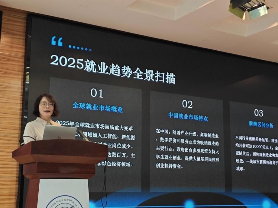 王海岚老师以“职途启航·步步为赢”为主题,结合我院专业特色详细分析了当前就业形势、就业市场现状以及就业方向和地域选择考量。重点从学生职业观和就业观塑造入手,解读了企业选人用人的底层逻辑,讲解了简历撰写的实用技巧以及现场面试的应对策略,为同学们明晰职业认知与求职技能提升提供了全面指导。最后,她鼓励同学们树立远大理想,终身学习,在服务国家重大战略的征程中,书写出无愧于时代、无愧于青春的壮丽篇章。
