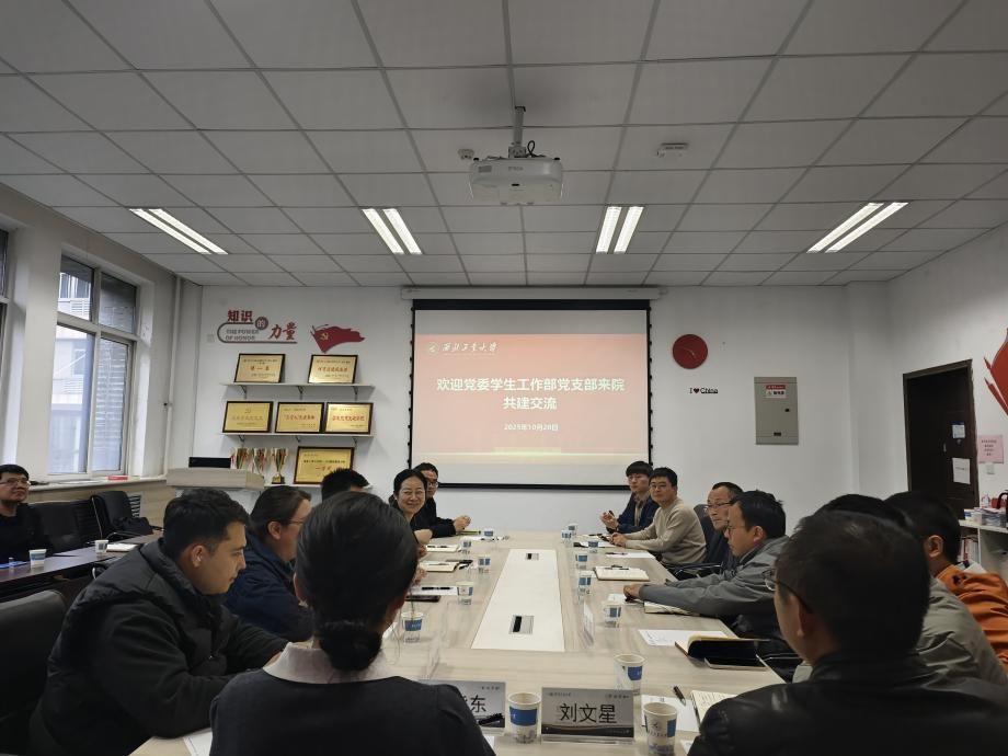 10月28日下午,学校党委学生工作部党支部一行7人来我院共建交流。党委学生工作部副部长、学生处副处长彭蓉、管峻及学工部党支部成员,我院党委书记孙华强、学院专职辅导员及部分兼职辅导员参加了本次座谈会。