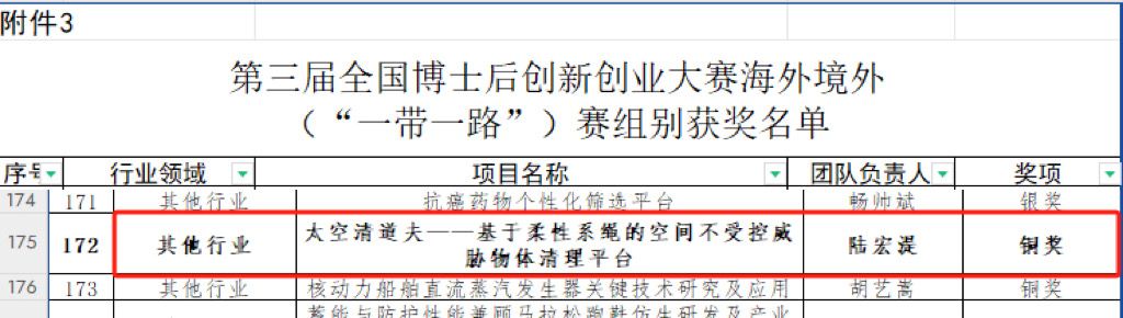 近日,第三届全国博士后创新创业大赛总决赛落下帷幕。我院空间系绳与飞行器控制团队成员参赛项目《太空清道夫-基于柔性系绳的空间不受控威胁物体清理平台》,荣获第三届全国博士后创新创业大赛“海外境外”(“一带一路”)赛的“其他行业”赛道铜奖,这也是学院首次在该项全国性高水平赛事中获此佳绩。