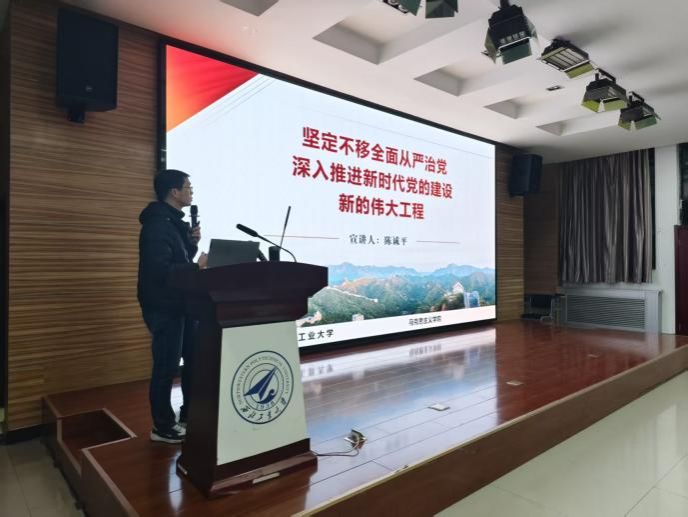 解读党的建设:马克思主义学院陈诚平老师以“党的建设”为主题,阐述了新时代党的建设新的伟大工程取得的成就:以八项规定强化理想信念、严密组织体系,以钉钉子精神纠治“四风”以正风肃纪,开展史无前例的反腐败斗争,还找到了自我革命这一跳出治乱兴衰历史周期率的第二个答案。他强调,要从坚持和加强党中央集中统一领导、坚持不懈用习近平新时代中国特色社会主义思想凝心铸魂等多方面发力,坚定不移全面从严治党、深入推进新时代党的建设新的伟大工程。