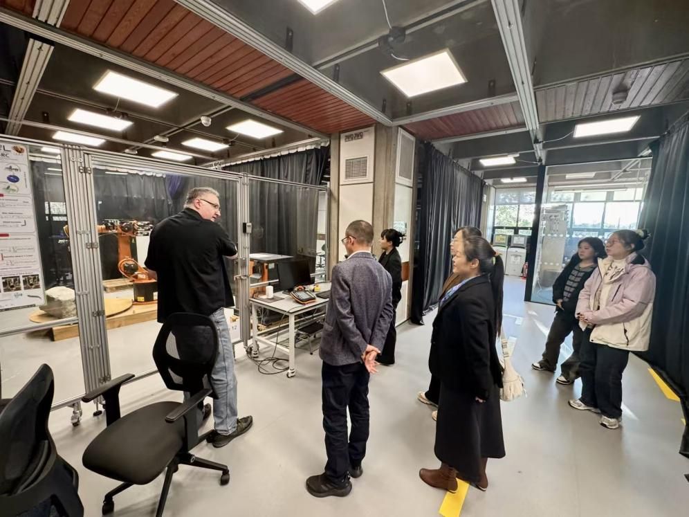 访问团还与冶金与材料学院的 Rustam Stolkin 教授(现任学院机器人学科主席、英国皇家学会工业研究员)进行深度学术交流,并实地参观其带领的伯明翰极端机器人实验室(Birmingham Extreme Robotics Lab, ERL)。作为欧洲极具影响力、英国规模领先的机器人研究机构,ERL 以跨学科机器人与人工智能(RAI)前沿研究为核心,重点攻克核能等极端环境下的工程应用难题,拥有 900 平方米定制化实验室及超级计算机、高规格机械臂、VR/AR 人机交互系统等顶尖设备,科研实力雄厚。
