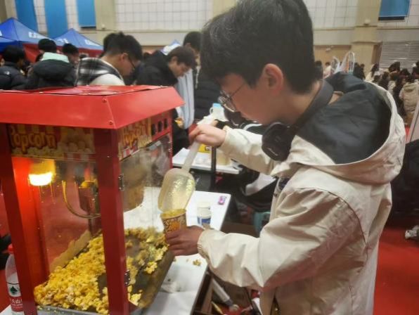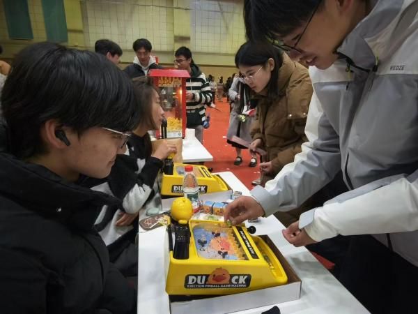 瞄准、投掷,在投壶区,同学们屏气凝神,体验着传统文化的独特韵味,即便未能投中,周围传来的鼓励与欢笑也让人暖意洋洋;弹珠机上,一颗颗弹珠在划出优美的弧线,满载着期待飞向目标,游戏唤醒了大家心底的童真,同学们在尽情玩乐中释放压力、收获快乐,欢声笑语回荡在体育馆上空。学院学生会的同学还为大家准备了爆米花、夹心饼干和可乐,作为奖品和休闲零食共同分享。