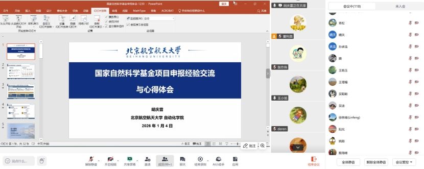 为进一步助力学院2026年度国家自然科学基金项目申报,1月4日下午,我院举办国家自然科学基金申报专家讲座(第二场),邀请北京航空航天大学自动化科学与电气工程学院院长胡庆雷教授,通过线上和线下相结合的形式,作题为“国家自然科学基金申报体会”专题讲座。院内外教师130余名参加会议。会议由副院长王小旭主持。
