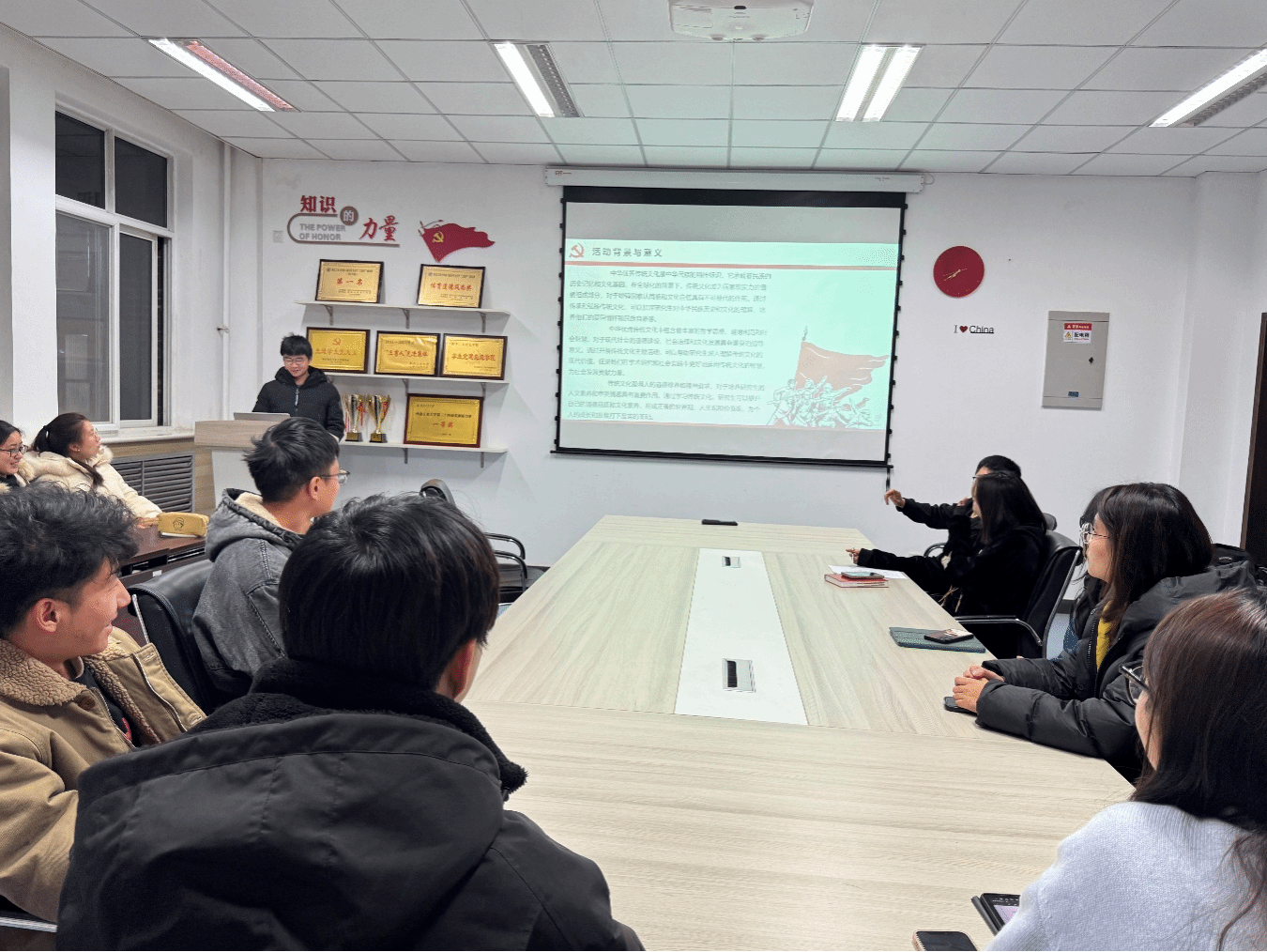 活动在晚上正式开始。首先开展的是爱国主义精神专题活动,由学院研会就业实践部的段浩淼同学主讲。他围绕爱国主义的内涵、意义以及能带给我们的启发等方面,进行了详细讲解。段浩淼同学结合具体事例,深入浅出地阐述了爱国主义在不同时代的体现,让大家了解到爱国主义并非抽象的概念,而是与我们的生活、国家的命运紧密相连。他的讲述让在场的同学们深受触动,不少同学表示,通过这次学习,更加深刻地认识到爱国是一种责任,也是一种担当,今后会努力将爱国之情转化为实际行动,在学术研究和日常实践中贡献自己的力量。